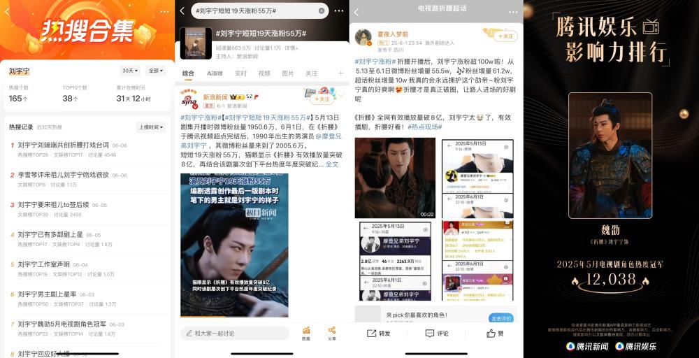 5 月,古装剧《折腰》强势爆火,剧集热度一路飙升。乱世枭雄魏劭迅速出圈,“魏劭”一角斩获腾讯娱乐 5 月影响力排行电视剧角色热度冠军,饰演该角色的刘宇宁也随之在 30 天内斩获 165 个热搜、19 天微博涨粉 55 万、全网涨粉超 100 万。