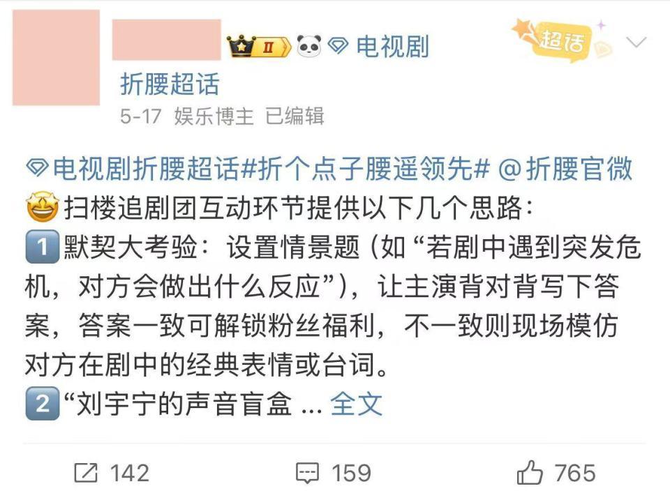 不光如此,粉丝们还围绕剧集热点积极二创,主动参与官方发起的互动活动,并且提出“默契大考验”“魏劭式口是心非挑战”等粉丝参与建议,丰富了社群的互动感和“活人感”,也显现出一个成熟粉丝群体应有的互动活力和情绪温度。其乐融融间,更多观众被《折腰》吸引入坑,剧集的路人盘就此不断扩大。