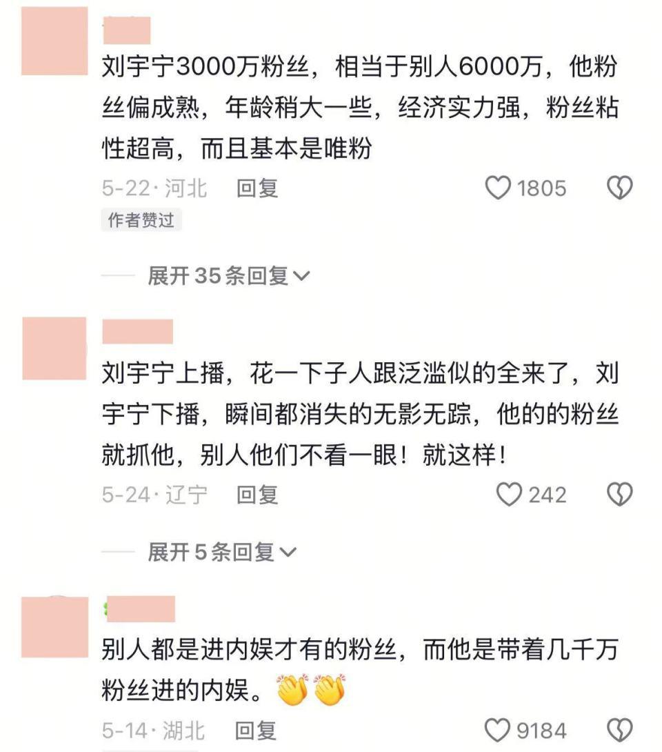 与多数偶像粉丝群体不同,刘宇宁的粉丝画像显得“反饭圈”特征鲜明:整体年龄层偏高,职业背景多元,追星的起点也不走寻常路——许多人并非是被话题吸引或是被颜值“秒杀”,而是被刘宇宁直播间里的性格和人品慢慢打动,一步步走入坑、留下来。